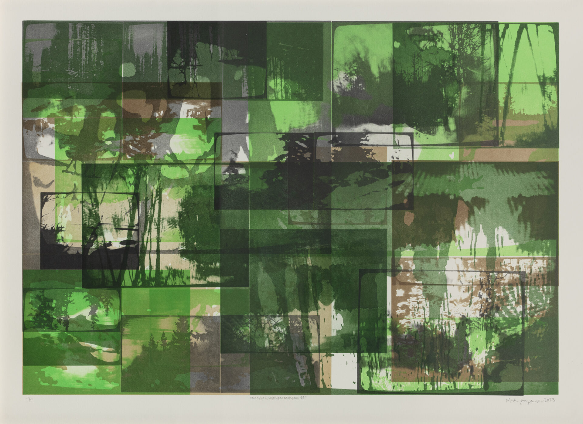 Maastokuvioiset maisemat ovat uniikkivedoksia, jotka on vedostettu maastokuviokankaan väreissä hyödyntäen taiteilijan aiempien grafiikanteosten painolaattoja. Teossarjassa laattoja on yhdistelty uudelleen ja yllättävästi. Osa laatoista on teoksissa esimerkiksi vedostettu ylösalaisin.